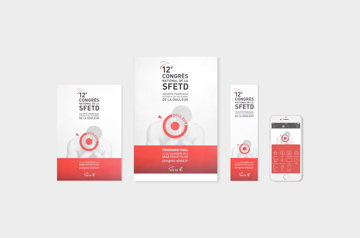 Refonte de l’identité visuelle du Congrès National de la Société Française d’Etude et Traitement de la Douleur. Le concept est de traduire la douleur et son intensité par des signes graphiques et la couleur rouge.