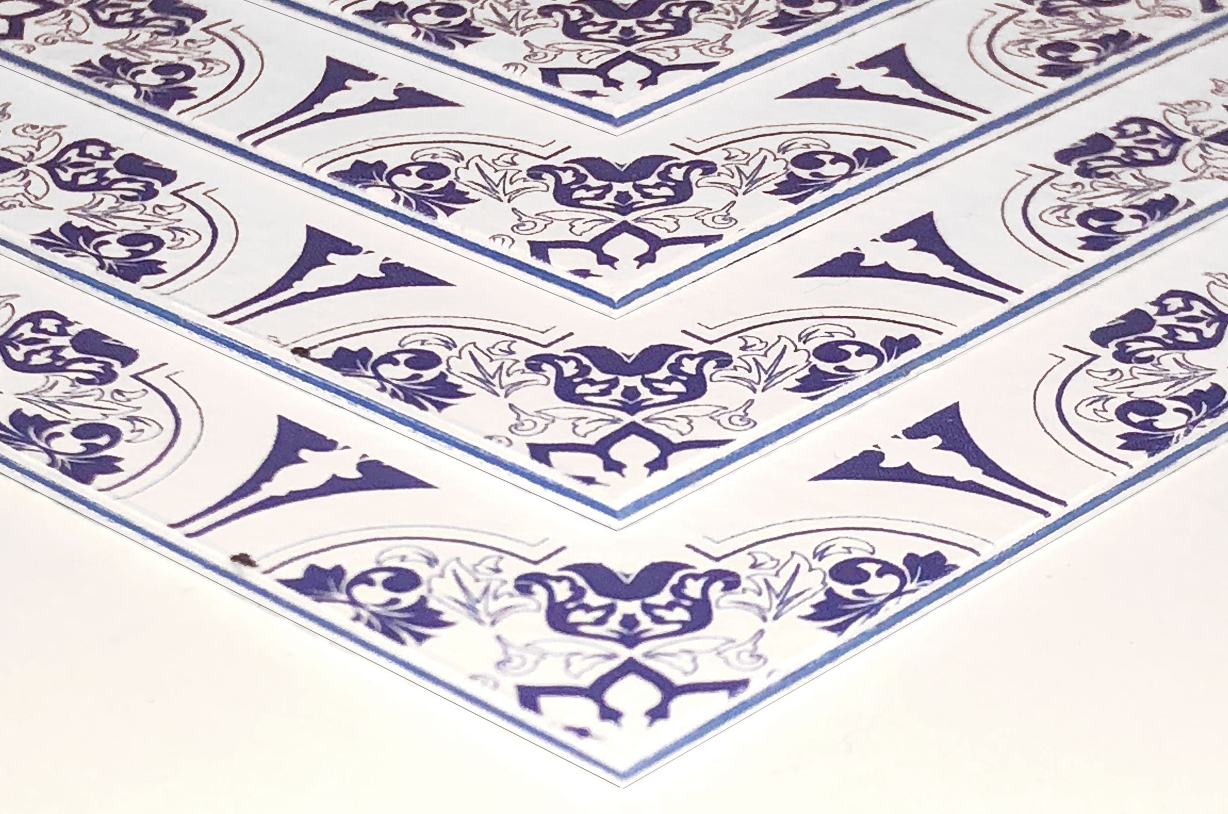 Inspiré des azuléjos portugais, cet encart très épais est constitué d’un double contre-collage avec au milieu une âme de papier de création coloré.